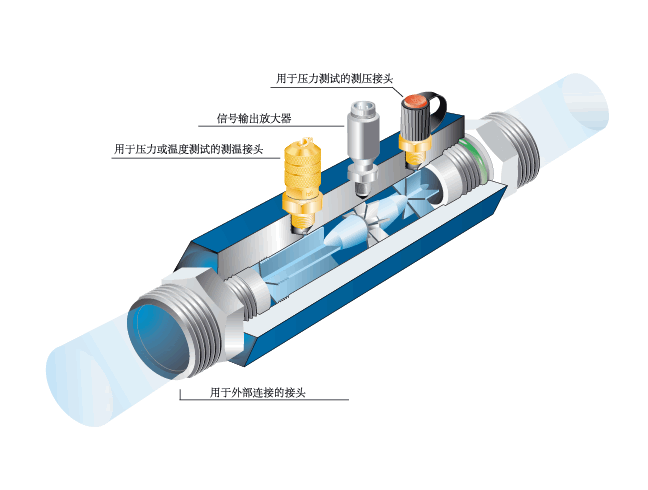 | 流量測量渦輪其實就是一個流量計。hydrotechnik渦輪流量計RE4的渦輪葉片由流動的液流來軸向驅動,轉速與流速成正比。通過渦輪葉片的旋轉來切割磁力線,從而每次產生脈沖信號并用一個非接觸的傳感器拾取該信號,這些脈沖信號可以直接顯示在與流量計連接的測量儀表上。渦輪流量計RE4系列的流量計的另一個優(yōu)點是帶有兩個監(jiān)測點,可同時測量壓力和溫度。 | |
