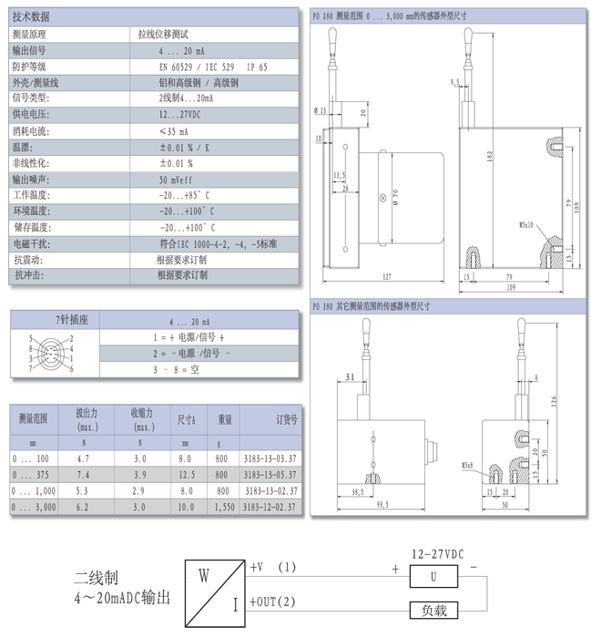 Hydrotechnik 位移傳感器概述 位移傳感器采用拉繩式原理。它無需外部引導很容易安裝和使用;廣泛應(yīng)用于吊車、油壓機及其它設(shè)備的距離測量。所有機械和電子部件都有堅固的外殼。內(nèi)有特別制造的校準金屬線的部件,以防止金屬線在內(nèi)部鼓輪上進出線時隨便的擺動,從而高精的控制好金屬線進出的方向,保證了電子部分轉(zhuǎn)換成高精度、高穩(wěn)定、高顯線化的傳感器。同時傳感器不會因為環(huán)境的變化引起精度的變化。